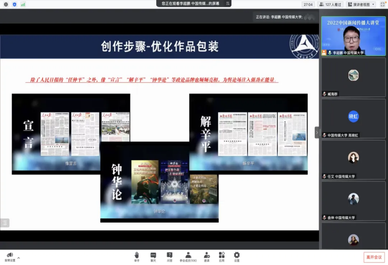为深入贯彻落实党的二十大精神,全面落实立德树人根本任务,夯实马克思主义新闻观教育,12月19日、21日、22日,中国传媒大学新闻传播学部学部长高晓虹“中国新闻传播大讲堂”编创团队研究生成员,走进女院课堂,为女院网络与新媒体专业全体师生带来了《“中国新闻传播大讲堂”课程导读》《“十年百变”融视频创作分享》《“大讲堂”短视频创作分享》三场精彩的讲座。中华女子学院院长、课程负责人刘利群教授和网新专业授课团队以及校内外师生130多人参加了线上学习。