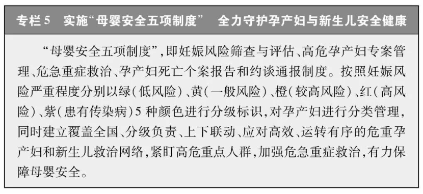 妇女健康水平大幅提高。2020年,妇女平均预期寿命已提高到80.9岁。2012年以来,全国住院分娩率持续稳定在99%以上,孕产妇系统管理率2024年达到94.9%,孕产妇死亡率从1995年的61.9/10万降至2024年的14.3/10万,下降了76.9%,远低于世界平均水平。中国妇幼健康核心指标(孕产妇死亡率、婴儿死亡率、5岁以下儿童死亡率)位居全球中高收入国家前列,提前实现联合国2030年可持续发展议程相关目标,被世界卫生组织列为妇幼健康高绩效的10个国家之一。