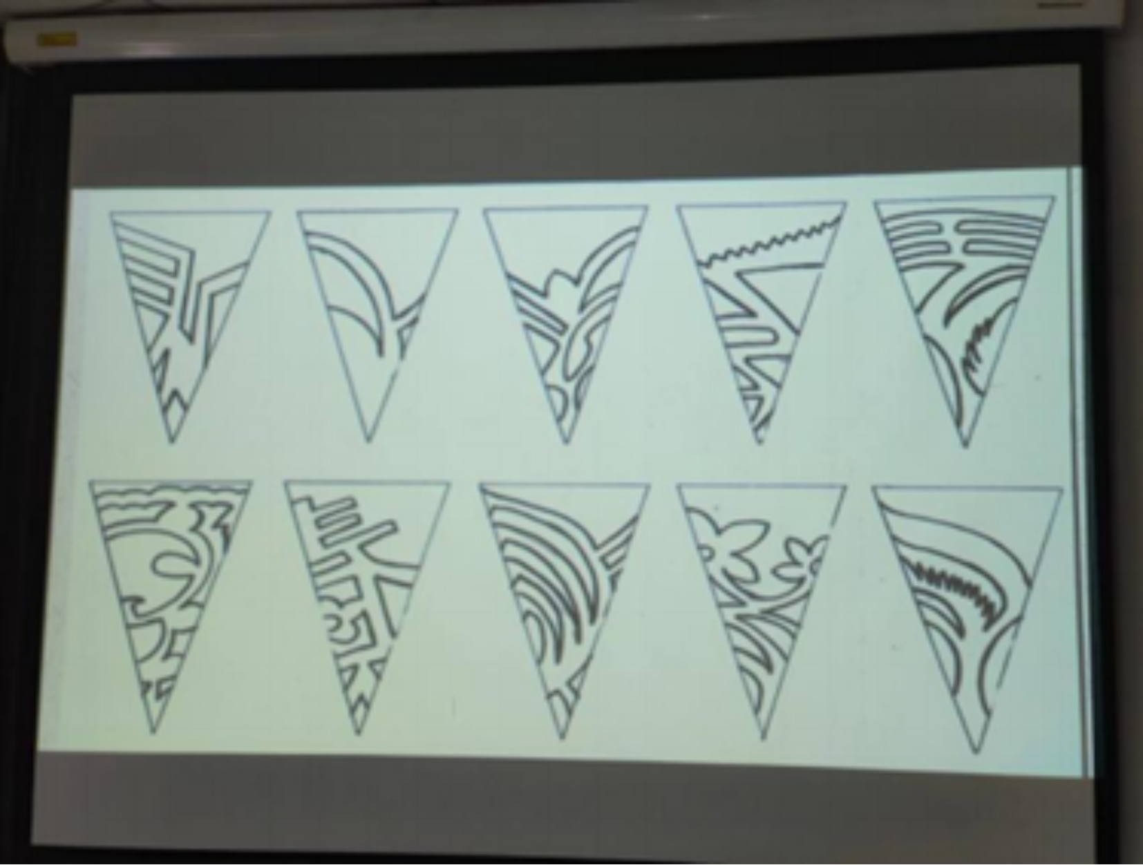 在邻旁教室的剪纸工作坊里,剪纸技艺的学习也在有条不紊地进行着。为了让同学们更好地了解剪纸的原理,谭老师通过画示意图的方式教同学们练习纸的五折、六折、八折等方法,之后是单色剪纸的大量练习。