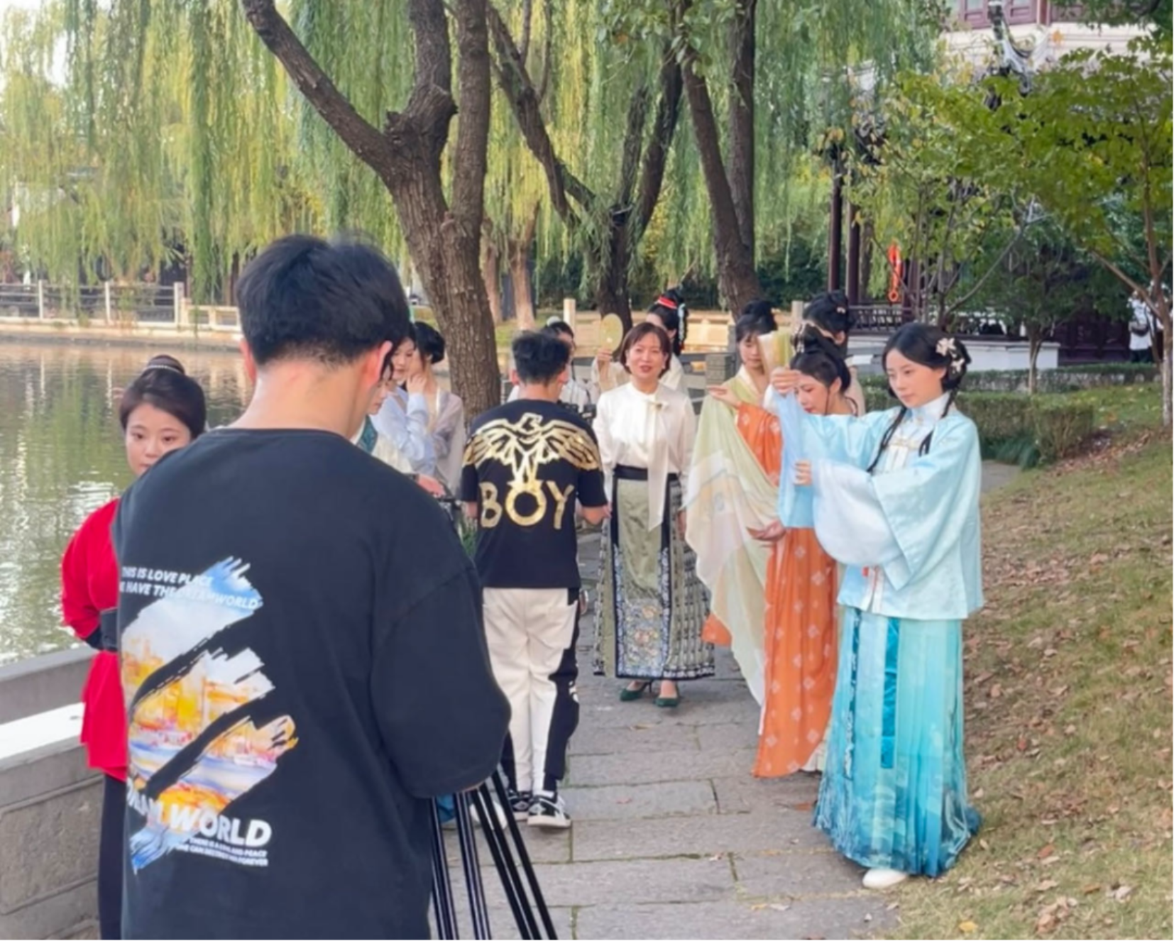 11月2日下午,老师和同学们抵达西塘古镇,随即按照计划紧锣密鼓地开展实践活动。带队老师与摄制小组走进古镇,提前采点、拍摄空镜、设计拍摄场景;负责服装造型指导的老师根据诵读的诗词、相应历史时期的服饰风格为学生调整造型、搭配服饰。