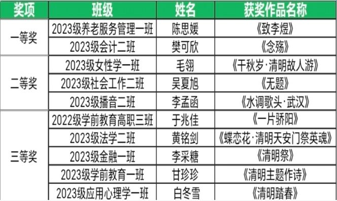 在本次活动中,同学们以踏青游春、祭祖习俗、缅怀先烈等为主题,创作原创诗歌,于诗词中感受春天的生机,同时活动还意在追思先烈,弘扬民族精神,厚植爱国情怀。北校区共有23个作品参与选拔,其中经过清明诗会工作小组匿名投票选出10个作品进入复赛,北校区教师评委组围绕诗歌作品的立意是否高远、是否紧扣主题,内容是否积极向上,文字表达是否饱满真挚等方面进行评议,最终选出一、二、三等奖。具体奖项人数及获奖名单如下: