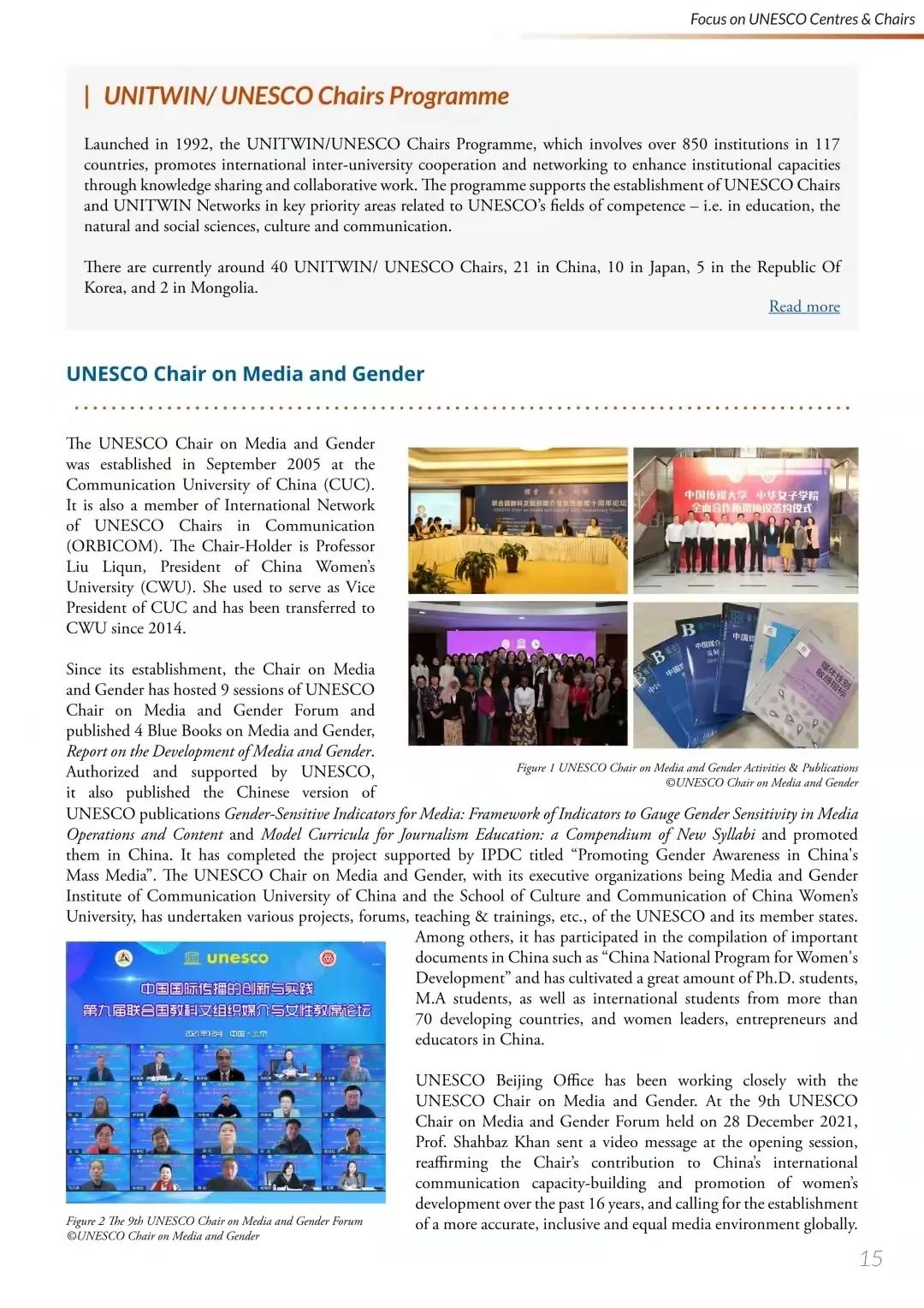 简报的“聚焦联合国教科文组织中心与教席”(Focus on UNESCO Centres & Chairs)部分特别聚焦“媒介与女性”教席。报道指出,教席成立以来已经连续举办九届联合国教科文组织媒介与女性教席论坛,连续出版四本《媒介与女性蓝皮书》。与教科文组织合作,翻译出版了《联合国教科文组织媒体性别敏感指标》《联合国教科文组织新闻教育新课程纲要》等教科文官方出版物。顺利完成了联合国教科文组织国际传播发展项目(IPDC)“提升中国大众传媒的性别意识”等主题项目。